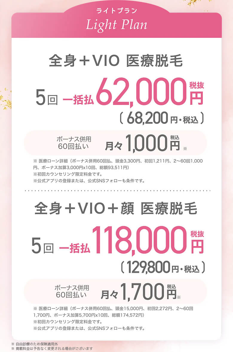 一方、「全身+VIO脱毛5回 プレミアムプラン(税込218,000円)」は、価格帯としては一般的な医療脱毛クリニックと同水準となります。